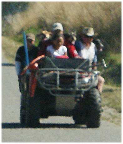 is a rare treat. The amazing tractor is on the beach at Castlepoint and used to launch the huge jet boats Below, sheep on the road, and ... with apologies for quality, 4 people and 3 dogs on a quad bike. (As you can imagine, I'm gutted about the poor quality pic) |