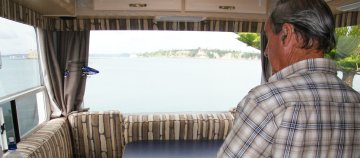 there too. Below left: Walkway at Omana, Rangitoto is in the background (the dormant (?) volcano just off Auckland) Below centre: John's latest toy, he flies it in the camper, you can just see it in front of the curtain (below right) |