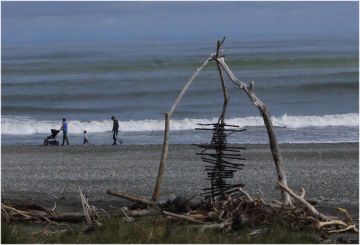 Driftwood sculpture on the beach at Hotitika and an armchair to admire the spectacle ~ not for long methinks, it's made of concrete |