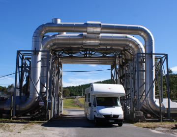 currently in production. Wells up to 2000 metres deep tap into zones at temperatures of 230 - 260C. When the fluid reaches the surface it is separated at the well head into dry steam and hot water in a cyclone separator. The hot water is either collected and piped to secondary 'flash' separators where additional dry steam is produced at lower pressure, or reduced to atmospheric pressure in well head silencers. The residual hot water is either piped to the power station, to reinjection wells on the steamfield perimeter or discharged to open drains. That's spectacular Around 1400 tonnes per hour of steam how do you weigh steam? is produced in the field and transmitted to the power station through insulated pipelines varying in diameter from 300 to 1200mm. Steam travels at about 200 kph in the pipelines. Many of these steam wells have been in production since the power station was commissioned in 1958 generating renewable steam and sustainable energy. John says, now you understood all that of course, and will be able to answer questions when asked. We may test you later. |