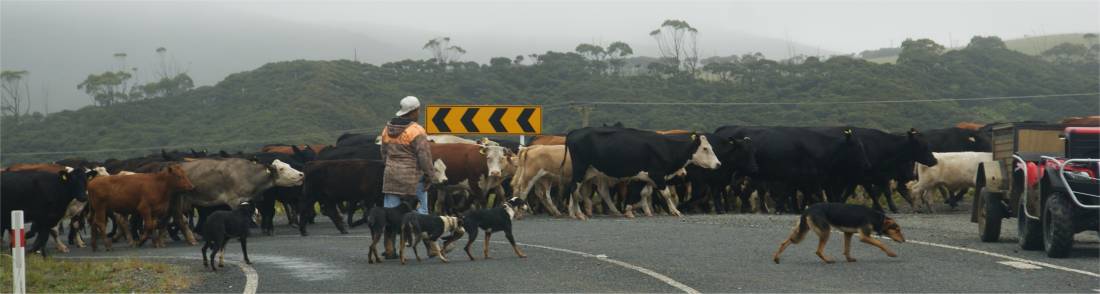 Taputaputa![]() It rained most of the next day so we stayed. The photo below is just to prove that the sea around New Zealand is not always blue ! ![]() and the gravel road out was quite 'interesting' in the morning. I would have liked to take some pics but needed both hands on the helm Later, the main road had a surprise for us. It's not all sheep here |
