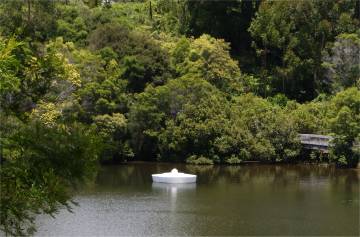 upstream. The road to nowhere still catches many Below right, giant plug swimming platform (?) in the river. |
